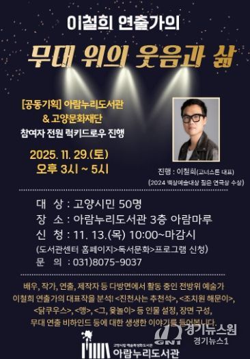[경기뉴스원/경기뉴스1] | 고양특례시 아람누리도서관은 오는 29일 오후 3시, 2024년 제60회 백상예술대상 젊은 연극상 수상자인 이철희 연출가를 초청해 예술특성화 프로그램 ‘무대 위의 웃음과 삶’을 운영한다.