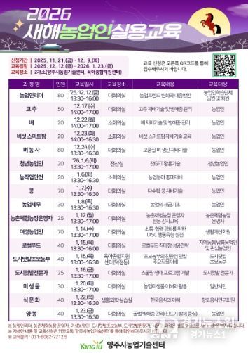[경기뉴스원/경기뉴스1] | 양주시가 변화하는 농업환경에 대응하고 농업인의 현장 문제 대응 능력을 높이기 위해 ‘2026년 새해농업인실용교육’ 교육생을 모집한다.