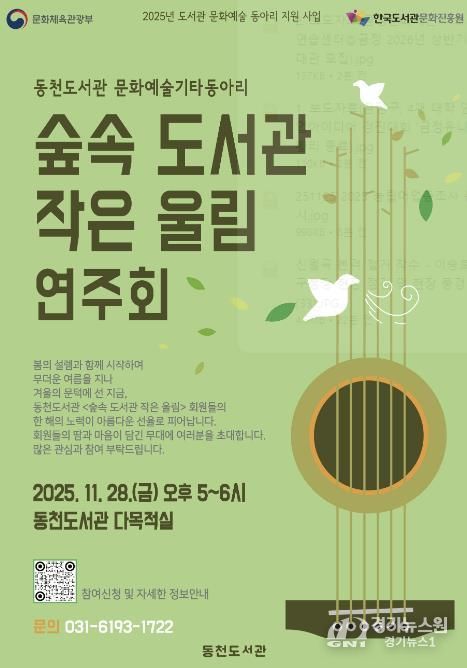 [경기뉴스원/경기뉴스1] | 용인특례시 동천도서관은 28일 오후 5시부터 6시까지 동천도서관 1층 다목적실에서 기타동아리 ‘숲속도서관, 작은 울림’의 연주회를 연다고 24일 밝혔다.