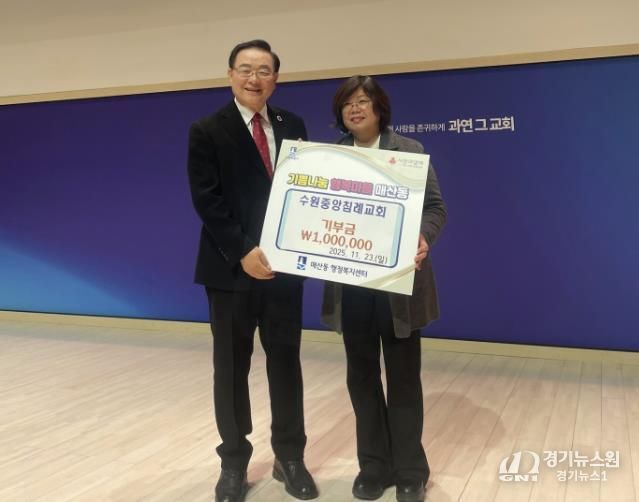 [경기뉴스원/경기뉴스1] | 수원중앙침례교회가 지난 23일, 지역 내 어려운 이웃을 돕기 위해 매산동 지역사회보장협의체 사회복지공동모금회 계좌로 성금 100만 원을 기탁했다.