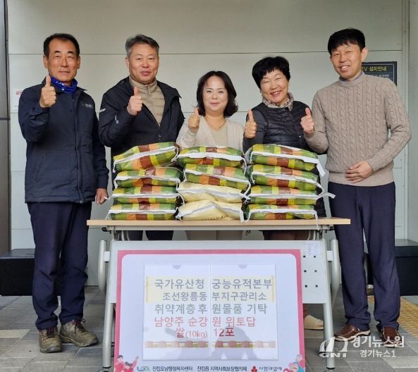 [경기뉴스원/경기뉴스1] | 남양주시는 26일, 국가유산청 조선왕릉동부지구관리소가 진접읍 내각리에 위치한 순강원의 위토답에서 직접 수확한 쌀 10㎏ 12포를 진접읍 지역사회보장협의체에 기탁했다고 밝혔다. 순강원은 조선 선조의 후궁인 인빈 김씨의 무덤이며, 위토답은 능의 제사나 관리에 필요한 비용을 충당하기 위해 마련된 토지다.
