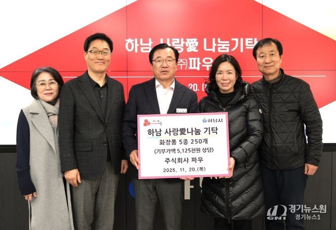 [경기뉴스원/경기뉴스1] | 11월 20일 목요일 하남시청에서 ㈜파우 FAU 대표(최미화)는 하남시가족센터에 하남 사랑愛나눔 기탁으로 5,125,000원 상당의 화장품 5종 250개를 지정 기탁했다.