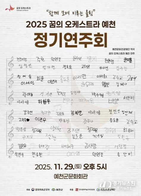 [경기뉴스원/경기뉴스1] | 예천문화관광재단은 오는 29일 오후 5시, 예천군문화회관에서 '2025 꿈의 오케스트라 ‘예천’ 정기연주회 '함께 모여 이루는 울림''을 개최한다.