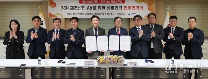 [경기뉴스원/경기뉴스1] | 강원특별자치도는 11월 27일 오후 3시, 강원 제조산업의 AX(AI Transformation, 인공지능 전환)를 위한 상호 협력을 강화하기 위해 한국생산기술연구원(원장 이상목)과 업무협약(MOU)을 체결했다.