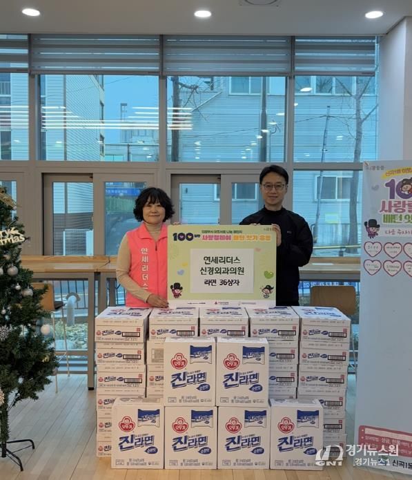 [경기뉴스원/경기뉴스1] | 의정부시 신곡1동주민센터는 11월 27일 연세리더스신경외과의원이 저소득 취약계층을 돕기 위해 라면 36상자를 기탁하며 ‘100일간 사랑릴레이 배턴 잇기’에 동참했다고 밝혔다.