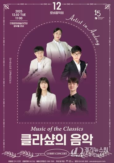 [경기뉴스원/경기뉴스1] | 안동문화예술의전당은 지역예술인들에게 다양한 무대 경험을 제공하고, 시민에게는 일상 속 음악 향유할 수 있는 기회를 마련하고자, 매월 첫째 주 화요일 오전 11시에 로비음악회 시리즈를 진행하고 있다. 올해 마지막 로비음악회는 ‘클라샵’의 공연으로 12월 2일 오전 11시, 웅부홀 로비에서 '클라샾의 음악'이라는 제목으로 개최된다.