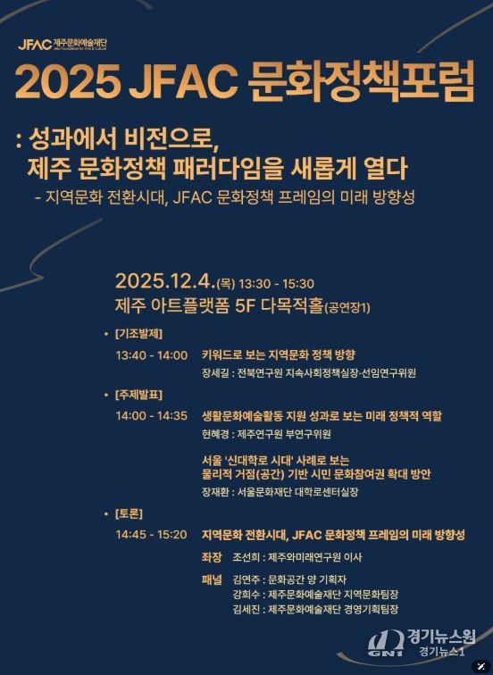 [경기뉴스원/경기뉴스1] | 제주문화예술재단(이사장 김석윤)은 '다시 심는 성과, 피어나는 비전'이라는 슬로건으로 '2025년 재단 성과공유주간(이하 성과공유주간)'을 개최한다. 프로그램은 제주아트플랫폼(5층)에서 12월 4일부터 6일까지 3일간 진행된다.