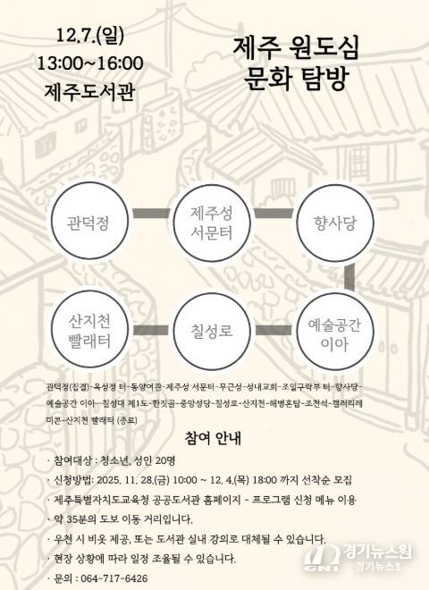 [경기뉴스원/경기뉴스1] | 제주도교육청 제주도서관은 7일 도내 청소년 및 성인을 대상으로 제주의 역사와 문화적 가치를 재조명하는 ‘제주 원도심 문화 탐방’ 프로그램을 운영한다.