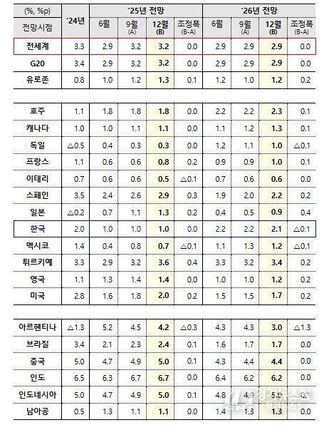 세계경제 성장 하방 위험요인으로 ➊무역정책의 추가적인 변화, ➋인플레이션 압력 재부상, ➌자산 가격의 급격한 조정에 따른 금융시장 위험 확대, ➍재정건전성 악화에 따른 금융 여건 위축 등을 제시했다. 상방 요인으로는 ➊무역장벽 완화(reversal of the increase in trade barriers), ➋지정학적 불확실성 감소, ➌인공지능(AI) 관련 투자를 통한 생산성 증가 등을 언급했다.
