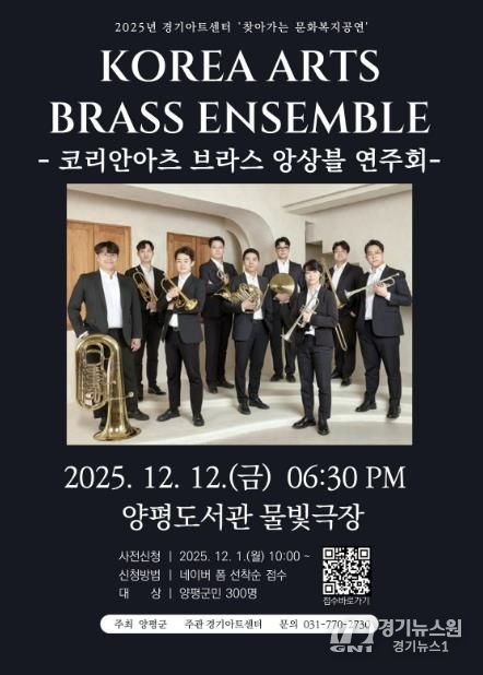 [경기뉴스원/경기뉴스1] | 양평군은 지역 주민에게 품격 있는 문화 향유 기회를 제공하고자 오는 12월 12일 양평도서관 물빛극장에서 ‘연말 맞이 찾아가는 문화복지 공연’을 개최한다고 밝혔다.