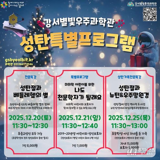 [경기뉴스원/경기뉴스1] | 서울 강서구 강서별빛우주과학관(금낭화로 178)은 연말과 성탄절을 맞아 다채로운 천문 프로그램을 운영한다.
