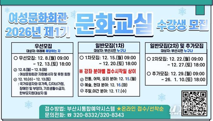 [경기뉴스원/경기뉴스1] | 부산시 여성문화회관은 오는 내일(8일)부터 '2026년 제1기 문화교실' 수강생을 모집한다고 밝혔다.