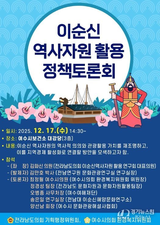 [경기뉴스원/경기뉴스1] | 여수시의회에 따르면, 오는 17일 오후 2시 30분 여수시 보건소 3층 회의실에서 지역이 보유한 이순신 관련 역사·문화자원의 미래 활용 방안을 논의하는 ‘이순신 역사자원 활용 정책토론회’를 개최한다.