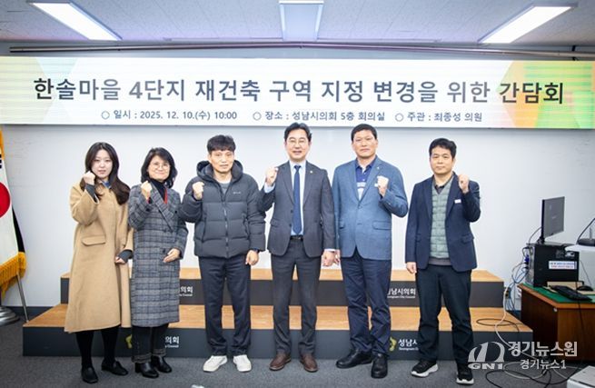 [경기뉴스원/경기뉴스1] | 성남시의회 더불어민주당 최종성 의원(분당,수내3,정자2·3,구미)은 12월 10일 성남시의회 5층 회의실에서 ‘한솔마을 4단지 재건축 구역 지정 변경 간담회’를 개최했다고 밝혔다.