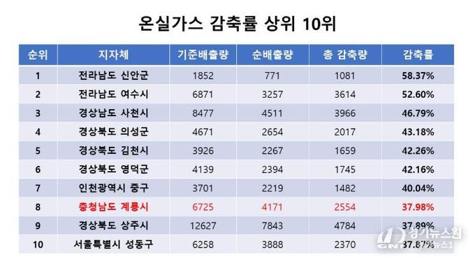 [경기뉴스원/경기뉴스1] | 계룡시는 공공부문 온실가스 감축률 평가에서 전국 243개 지방자치단체 중 8위를 기록해 충청남도 내 유일하게 ‘상위 10개 기관’에 선정됐다고 11일 밝혔다.