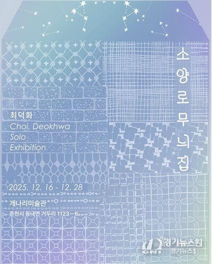 [경기뉴스원/경기뉴스1] | 강원문화재단(대표이사 신현상)은 '2025 강원다운작품개발지원' 2년차 지원사업에 선정된 최덕화 작가의 개인전 '소양로 무늬집'이 오는 16일부터 28일까지 춘천 개나리미술관에서 개최된다고 밝혔다.