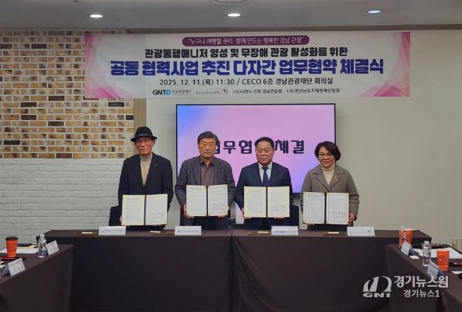 [경기뉴스원/경기뉴스1] | 경상남도관광재단은 11일 오전 12시 창원컨벤션센터에서 경상남도가족센터, 대한노인회 경남연합회, 경상남도지체장애인협회와 무장애 관광 활성화를 위한 다자간 업무협약을 체결했다고 밝혔다.