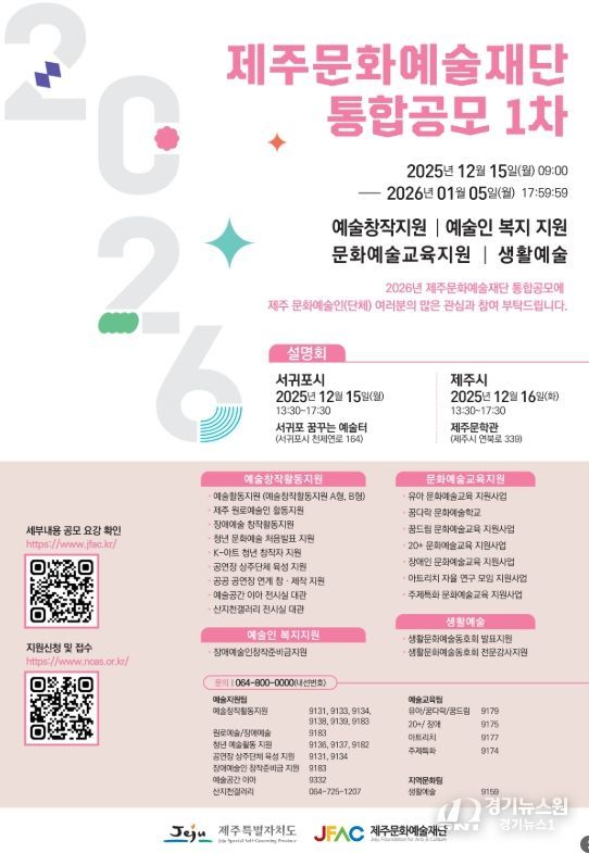 [경기뉴스원/경기뉴스1] | 제주문화예술재단(이사장 김석윤)은 2026년도 지원사업 1차 통합공모를 실시한다. 접수 기간은 2025년 12월 15일부터 2026년 1월 5일까지이며, 문화예술교육 지원사업은 2026년 1월 9일까지 접수한다.