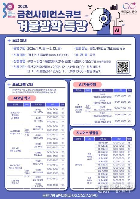 모든 프로그램은 무료로 운영된다. 금천구 초등학생은 12월 16일 오전 10시부터 홍보물의 정보무늬(QR코드) 또는 금천구청 누리집 '통합예약'-'교육/강좌'-'금천사이언스큐브'에서 선착순으로 신청할 수 있다. 자세한 일정은 신청 화면과 홍보물에서 확인하면 된다.