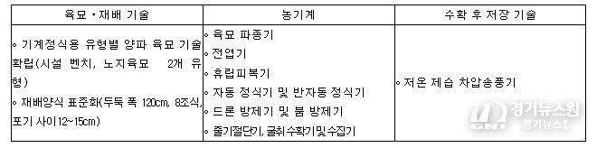 한편, 농촌진흥청은 농촌 인구 감소와 고령화로 일손 구하기가 힘든 현장의 어려움을 해결하고자 기계 개발 연구에 재배 기술, 저장 등 다른 기술을 연계한 밭작물 전 과정 기계화를 추진하고 있다.