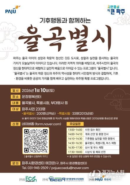 [경기뉴스원/경기뉴스1] | 파주시환경센터 ‘에코온’은 파주를 대표하는 조선시대 사상가 율곡 이이의 학문 정신을 현대적 기후행동 가치로 재해석한 기후문화축제 ‘기후행동과 함께하는 율곡별시’를 오는 내년 1월 10일 운정행복센터에서 개최한다.