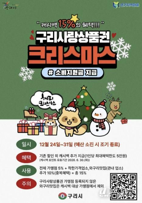 [경기뉴스원/경기뉴스1] | 구리시는 12월 24일부터 ‘구리사랑상품권 크리스마스 소비 지원금’을 지급한다고 밝혔다. 이번 소비 지원금은 연말연시 기간 지역 외로 유출되는 소비를 지역 내로 유도하고, 관내 상권 활성화와 소상공인 보호를 위해 마련됐으며, 예산 소진 시 조기 종료될 수 있다.