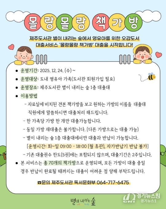 [경기뉴스원/경기뉴스1] | 제주도교육청 제주도서관은 24일부터 영유아 오감도서 대출 서비스 ‘몰랑몰랑 책가방’을 운영한다.