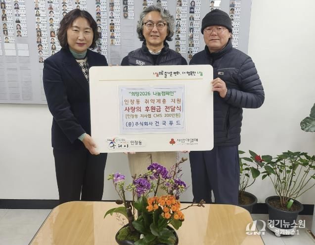 [경기뉴스원/경기뉴스1] | 구리시 인창동 행정복지센터는 지난 12월 23일 인창동에 소재한 ㈜건국푸드로부터 취약계층 지원을 위한 후원금 200만 원을 지정 기탁받았다고 밝혔다.