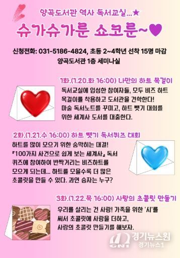 [경기뉴스원/경기뉴스1] | 김포시는 2026년 1월 20일 오후 4시부터 6시까지 1층 세미나실에서 초등학교 2~4학년을 대상으로 한 역사 독서교실 '슈가슈가룬 쇼코룬'을 운영한다.