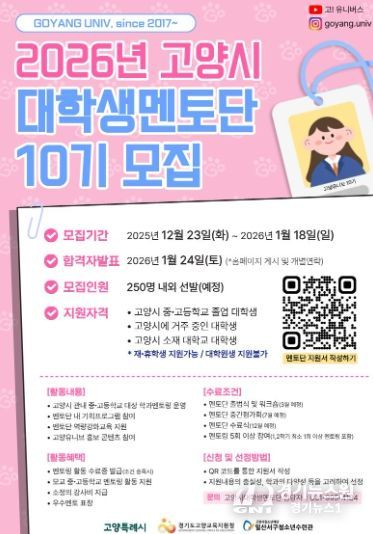 [경기뉴스원/경기뉴스1] | 고양특례시가 지역 청소년들의 진로 설계를 도울 대학생 멘토단 ‘고양유니브’의 2026년도 신입 단원을 1월 18일까지 모집한다고 밝혔다.