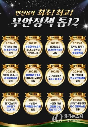 [경기뉴스원/경기뉴스1] | 부안군은 민선 8기 출범 이후 추진해 온 주요 정책 성과를 종합적으로 되짚고 앞으로의 군정 방향과 실천 의지를 군민과 공유하기 위해 민선 8기 최초·최고 부안정책 톱12를 선정·발표했다고 밝혔다.