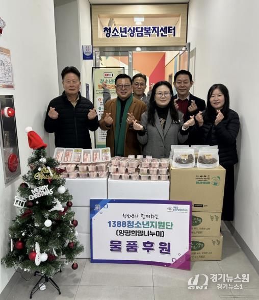 [경기뉴스원/경기뉴스1] | 양평군청소년상담복지센터는 지난 24일 1388청소년지원단으로부터 위기청소년을 위한 후원물품을 전달받았다고 밝혔다. 이날 전달식에는 임청우 단장과 양평 목우촌 문현길 대표가 참석해 돼지고기와 둥굴레차 세트 70개를 양평군청소년상담복지센터와 양평군학교밖청소년지원센터에 기부했다.