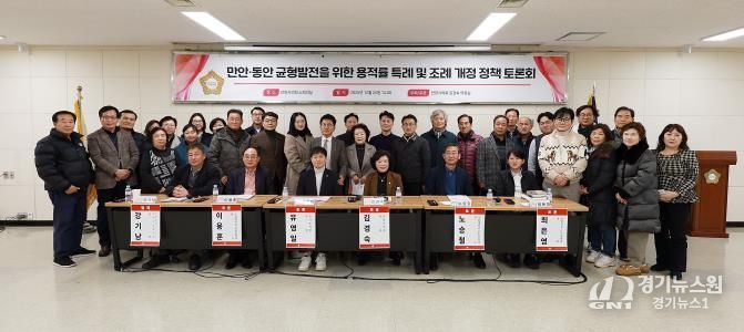 [경기뉴스원/경기뉴스1] | 안양시의회 김경숙 의원(국민의힘, 석수1·2동·충훈동)은 12월 24일 시의회 소회의실에서 '만안·동안 균형발전을 위한 용적률 특례 및 조례 개정 정책토론회'를 개최하고, 만안과 동안 간 개발 격차 해소를 위한 다양한 정책 대안을 논의했다.