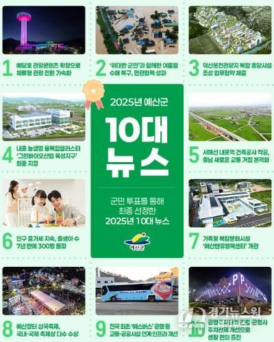 [경기뉴스원/경기뉴스1] | 예산군은 2025년 한 해 동안 군정 전반에서 의미 있는 성과를 거둔 주요 정책과 사업을 담은 ‘2025년 올해의 군정 10대 뉴스’를 지난 10일부터 24일까지 진행한 군민 투표를 통해 최종 선정했다고 밝혔다.