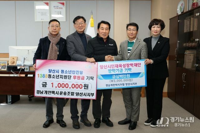 [경기뉴스원/경기뉴스1] | 경남개인택시조합 양산시지부(지부장 장태영)은 26일 양산시를 방문해 인재육성장학재단(이사장 이희종)에 장학금 300만원과 1388청소년지원단에 후원금 100만원을 기탁했다.