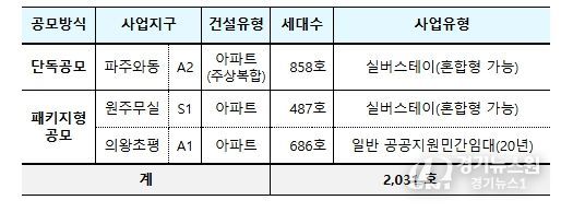 ②택지공모는 약 2천호 규모로 실시하며, 사업 대상지는 파주와동 A2 블록, 원주무실 S1 블록, 의왕초평 A1 블록 총 3곳이다. 파주와동 A2 블록과 원주무실 S1 블록은 실버스테이로, 의왕초평 A1 블록은 임대의무기간이 20년인 일반 공공지원민간임대로 공급한다.
