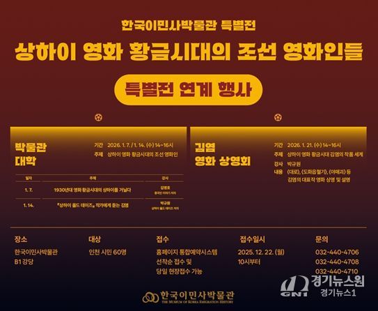 [경기뉴스원/경기뉴스1] | 인천광역시 시립박물관 분관 한국이민사박물관은 특별전 〈상하이 영화 황금시대의 조선 영화인들〉과 연계해 유명 작가 초청 특강을 개최한다고 밝혔다.