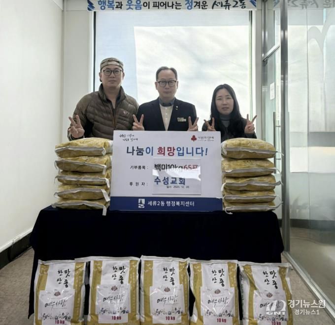 [경기뉴스원/경기뉴스1] | 지난 20일, 수원시 권선구 세류동에 소재한 수성교회는 연말연시를 맞아 세류2동행정복지센터에 백미 10kg 65포를 후원했다.