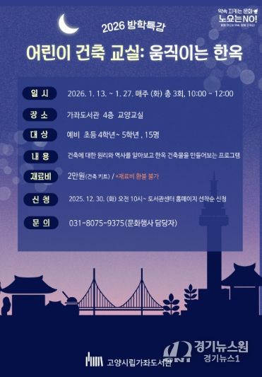 [경기뉴스원/경기뉴스1] | 고양특례시 가좌도서관은 2026년 1월 13일부터 27일까지 매주 화요일 3회차에 걸쳐 방학특강 프로그램 ‘어린이 건축 교실: 움직이는 한옥’을 운영한다고 밝혔다.