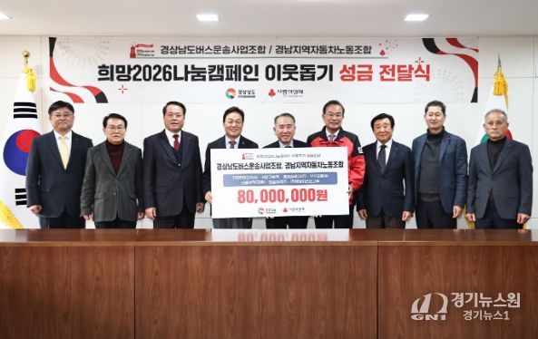 [경기뉴스원/경기뉴스1] | 경상남도는 29일 도청 소회의실에서 경남버스운송사업조합(이사장 양기환)과 경남지역자동차노동조합(위원장 박지훈)이 도내 취약계층을 돕기 위한 성금 8천만 원을 전달했다고 밝혔다.
