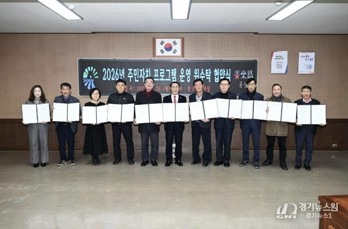 [경기뉴스원/경기뉴스1] | 홍성군은 지난 29일 군청 회의실에서 김노성 홍성군주민자치협의회장을 비롯한 11개 읍‧면 주민자치회장이 참석한 가운데 ‘2026년 주민자치센터 프로그램 운영 위‧수탁 협약식’을 개최했다.