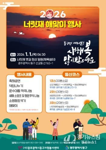 [경기뉴스원/경기뉴스1] | 광주 동구는 2026년 병오년 새해를 맞아 1월1일 오전 7시 너릿재 옛길 정상(체육쉼터)에서 해맞이 행사와 함께 방문객에게 떡국을 나누는 ‘2026년 병오년 해맞이 떡국나눔 행사’를 개최한다고 밝혔다.