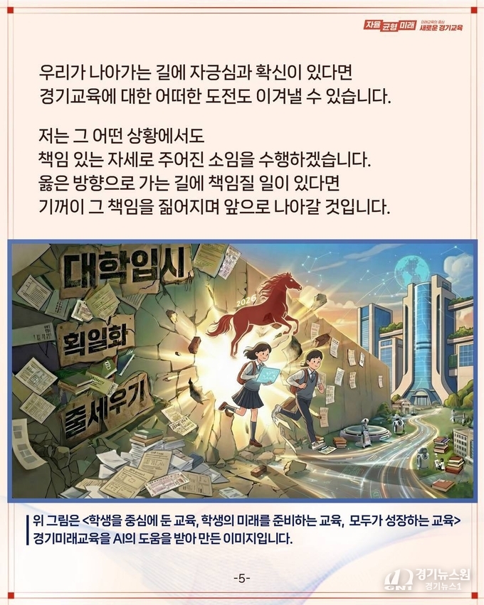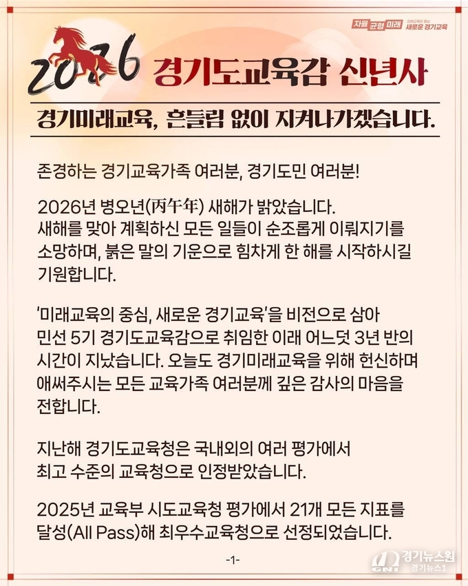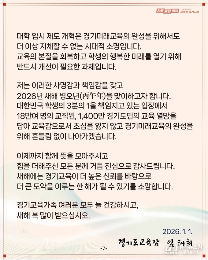 【경기=경기뉴스원/경기뉴스1】 | 임태희 경기도교육감은 2026년 병오년(丙午年) 신년사를 통해 “경기미래교육의 기조를 흔들림 없이 지켜나가겠다”며 학생 중심의 미래교육 정책을 지속 추진하겠다는 의지를 밝혔다.