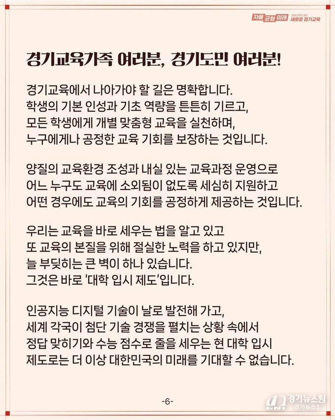 특히 대학 입시 제도 개혁의 필요성도 강하게 언급했다. 교육감은 “정답 맞히기와 수능 점수 중심의 현 입시 제도로는 대한민국 교육의 미래를 기대할 수 없다”며, 대학 입시 제도 개선이 경기미래교육 완성을 위한 시대적 과제라고 밝혔다.