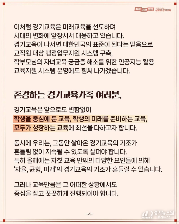 임태희 경기도교육감은 “경기교육은 앞으로도 학생을 중심에 둔 교육, 학생의 미래를 준비하는 교육, 모두가 성장하는 교육이라는 원칙을 지켜나갈 것”이라며, 올해 교육 환경 변화 속에서도 ‘자율·균형·미래’라는 경기교육의 핵심 기조를 유지하겠다고 강조했다.