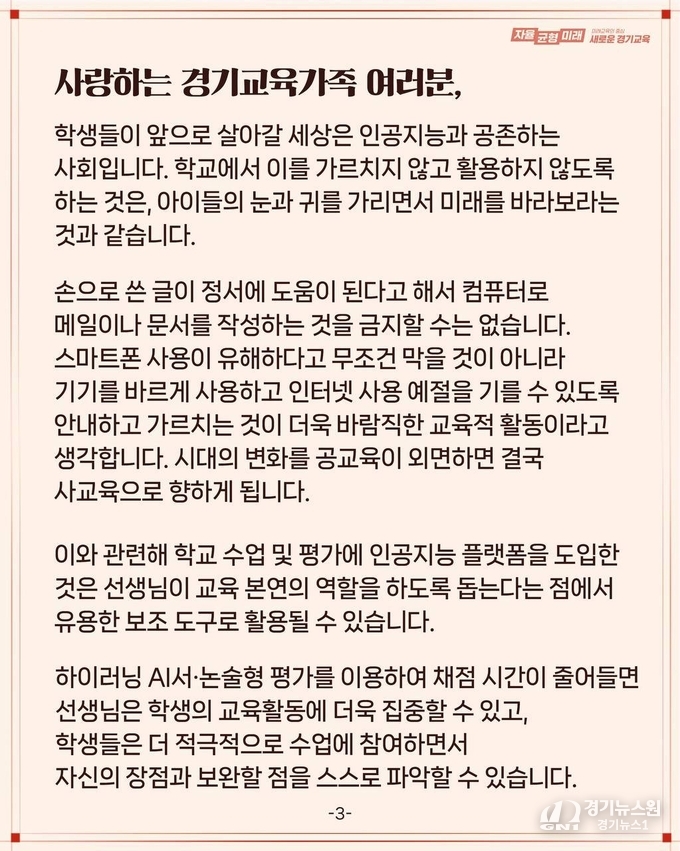 신년사에서 교육감은 인공지능과 공존하는 미래 사회를 대비한 교육의 중요성을 강조하며, 학교 현장에서의 인공지능 활용 확대 필요성을 분명히 했다. 인공지능 플랫폼을 활용한 수업과 논술형 평가, 하이러닝 AI 시스템 등을 통해 교사의 행정 부담을 줄이고 학생 개별 맞춤형 학습을 강화하겠다는 구상이다.
