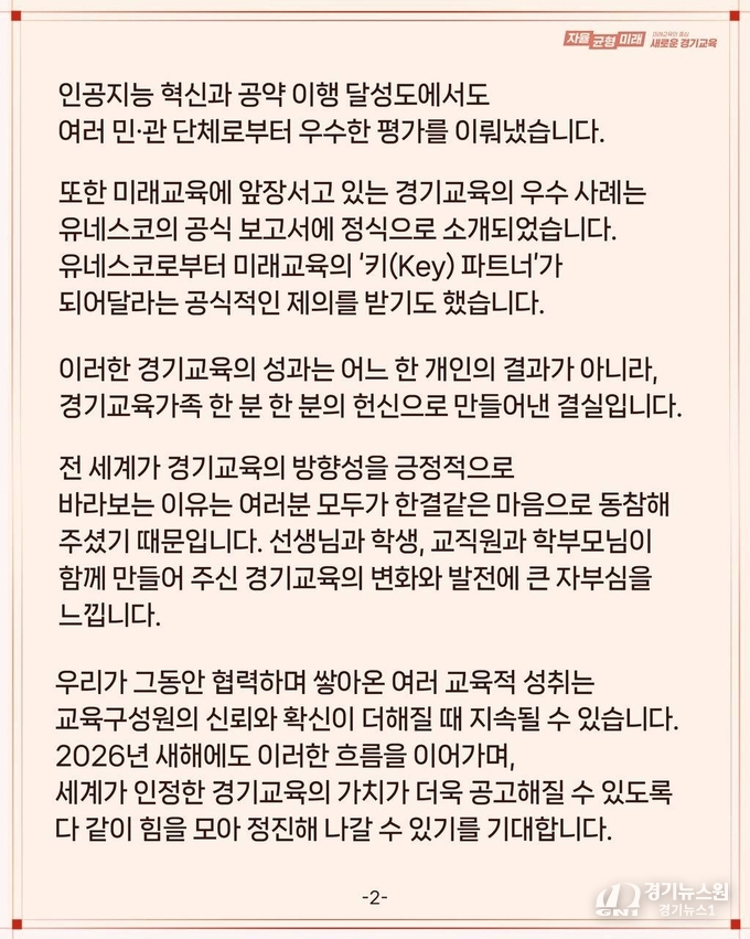 또한 경기교육의 미래교육 정책과 실천 사례가 유네스코 공식 보고서에 소개됐으며, 유네스코로부터 미래교육 분야의 ‘키(Key) 파트너’로 참여해 달라는 공식 제의를 받은 사실도 언급했다. 교육감은 “이 모든 성과는 경기교육가족 한 사람 한 사람의 헌신으로 만들어낸 결실”이라고 강조했다.