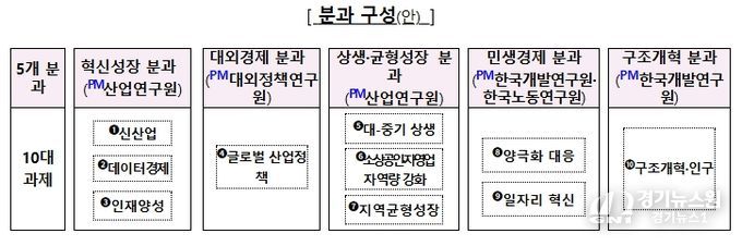 오늘 회의에서는 경인사연 소속 연구기관들이 집중 연구할 경제 대도약 10대 과제를 선별해 5개 분과로 편성하고 분과별 주관 연구기관(PM)을 지정했다. 아울러 연구 성과가 실제 정책으로 이어질 수 있도록 기재부를 중심으로 관계부처가 분과별 논의에 적극 참여해 연구기관들과 의견을 교환하도록 할 계획이다.