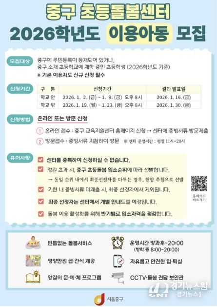 [경기뉴스원/경기뉴스1] | 서울 중구가 맞벌이 가정과 돌봄 공백이 발생하기 쉬운 가정을 지원하기 위해 2026학년도 새학기 초등돌봄센터 이용아동을 모집한다.