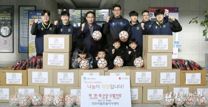 [경기뉴스원/경기뉴스1] | 수원시 장안구는 장안리틀풋볼아카데미가 지난 30일 장안구청에 라면 25상자와 축구공 20개 기부했다고 밝혔다. 이번 기부는 아카데미 회원들이 십시일반으로 정성을 모아 마련한 것으로, 장안구 관내 어려운 이웃들에게 전달될 예정이다.